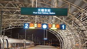 The Wuxi East Railway Station (Chinese: 无锡东站) is a high-speed railway station in Wuxi, Jiangsu, People's Republic of China. It is served by the Jinghu High-Speed Railway. It is opened on June 30, 2011.[1]