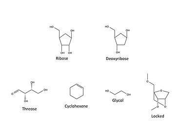 XNA exhibits a variety of structural chemical changes relative to its natural counterparts. Types of synthetic 'XNA' created so far include 1,5-anhydrohexitol nucleic acid (HNA) and cyclohexene nucleic acid (CeNA). Threose nucleic acid (TNA), glycol nucleic acid (GNA), locked nucleic acid (LNA), and peptide nucleic acid (PNA) are also other currently known XNAs that have been made and have more background information currently available than the previous two mentioned.[2] HNA could be used to potentially act as a drug that can recognize and bind to specified sequences. Scientists have been able to isolate HNAs for the possible binding of sequences that target HIV.[5] With cyclohexene nucleic acid, research has shown that CeNAs with stereochemistry similar to the D form can create stable duplexes with itself and RNA. It was shown that CeNAs are not as stable when they form duplexes with DNA.[6]