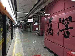 Xiajiao Station (Chinese: 厦滘站) is a station on Line 3 of the Guangzhou Metro that started operations on 28 December 2006. It is located under Xiajiao Village (Chinese: 厦滘村) in Shajiao Island (Chinese: 沙滘岛), Panyu District, Guangzhou, Guangdong Province, China. It is near Wuzhou Decoration Center, Shaxi Plastic Center, the White Palace Hotel and the White Palace Theater.[1][2][3]