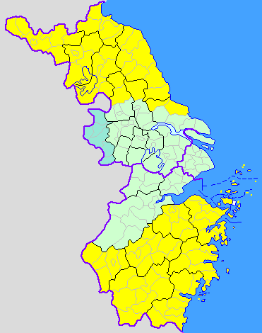 - Jiangsu Province: Nanjing, Suzhou (including county-level urban centres of Changshu, Taicang, Kunshan, Wujiang and Zhangjiagang), Wuxi (including county-level urban centres of Jiangyin and Yixing), Nantong (including county-level urban centres of Rugao, Haimen, and Qidong), Changzhou (including county-level urban centres of Jintan and Liyang), Yangzhou (including urban centre of Yizheng), Yancheng (including county-level urban centres of Dafeng and Dongtai), Taizhou (including county-level urban centres of Jiangyan, Jingjiang, Taixing and Xinghua), Zhenjiang (including county-level urban centres of Danyang, Jurong and Yangzhong), Huai'an.
