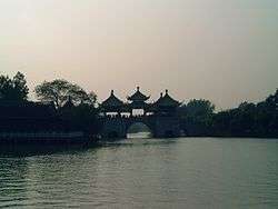 Guangling (Chinese: 廣陵; pinyin: Guǎnglíng; Wade–Giles: Kuang-Ling), the first settlement in the Yangzhou area, was founded in the Spring and Autumn period. After the defeat of Yue by King Fuchai of Wu, a garrison city was built 12 metres (39 ft) above the water level on the north bank of the Yangtze c. 485 BC. This city in the shape of a three by three li square was named Hancheng.[2] The newly built Han canal formed a moat around the south and east sides of the city. The purpose of Hancheng was to protect Suzhou from naval invasion from Qi. In 590, the city began to be called Yangzhou, which was the traditional name of what was the entire southeastern part of China then.