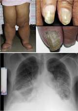 | Yellow nail syndrome: This patient has a 20-year history of severe lymphedema of her legs; thick, ridged, yellowish, hypercurved thumbnails (top right); similarly affected, yellow-green to brown toenails (bottom right); and bilateral, chylous pleural effusions. A sample of her chylous pleural fluid is shown to the left of the radiograph. | |