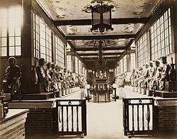 A luohan (often written luóhàn) is the Chinese term for an arhat, one of the historical disciples of the Buddha. As Buddhist tradition developed, and especially in the East Asian Buddhist countries, the number of arhats or luohans tended to increase, and at least the most important were regarded as, or as almost, bodhisattvas or fully enlightened beings, with a wide range of supernatural powers.[4] According to Buddhist tradition, groups of 16, 18 or 500 luohans awaited the arrival of Maitreya, the Future Buddha,[5] and groups were often used in East Asian Buddhist art. The full set is thought by most scholars to have had figures for the typical Chinese main grouping of Sixteen or Eighteen Arhats, although William Watson describes this "usual assumption" as "speculative". These and earlier smaller groupings of six or eight were each given names and personalities in Buddhist tradition.[6]