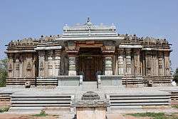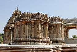 The entrance to the temple is through an open pillared porch (mukhamantapa) followed by a closed mantapa (or navaranga).[4][5] According to Hardy, the eastern side of the temple shows some later additions.[1] The porch consists of an awning supported by lathe turned half pillars and parapets on either side.[6] The closed hall which has no windows connects to the sanctum via a vestibule (called sukhanasi). The vestibule also as a tower (also called sukhanasi) which looks like a low protrusion of the main tower over the shrine. The inner walls of the shrine are square and plain where as the outer walls are semi-stellate (semi-star shaped) with numerous recesses and projections that are used for decorative relief consisting of Aedicula and pilasters. The outer wall of the vestibule is also decorative but is inconspicuous because it appears like a short continuation of the shrine outer wall. The ceiling of the closed hall is supported by four lathe turned pillars which divide the ceiling into nine decorated bays.[7] According to art historian Percy Brown the lathe turned pillars with four brackets above are a characteristic style of the Kalyani Chalukya-Hoysala architecture.[5]