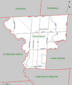 It consists of the part of the City of Toronto bounded on the north by the northern city limit, and on the east, south and west by a line drawn from the city limit south along Keele Street, west along Grandravine Drive, southeast along Black Creek, west along Sheppard Avenue West, south along Jane Street, west along Highway 401, and northwest along the Humber River to the northern city limit.