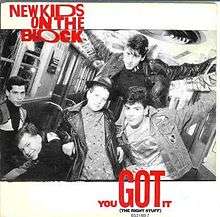 "You Got It (The Right Stuff)" is a 1988 single from New Kids on the Block. The lead vocals were sung by Jordan Knight and Donnie Wahlberg. The second single from the group's second album Hangin' Tough, it peaked at #3 on the Billboard Hot 100 Singles Chart in early 1989, while topping the UK charts in November 1989.[2] On the album, it was simply listed as "The Right Stuff." A Spanish version of the song was made ("Autentica") and peaked #11 in Spain Top 40 Radio.[3]