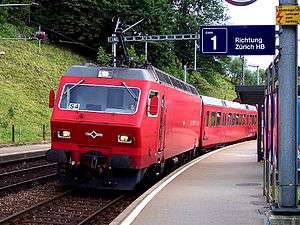 ![]() An S4 Sihltalbahn train of Sihltal Zürich Uetliberg Bahn (SZU), headed by Re 456 544, arrives at Zürich Brunau station | |||||||||||