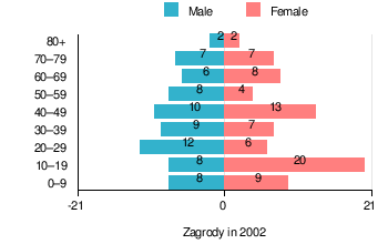 According to the 2002 Poland census, there were 146 people residing in Zagrody village, of whom 47.9% were male and 52.1% were female. In the village, the population was spread out with 26.7% under the age of 18, 36.3% from 18 to 44, 15.8% from 45 to 64, and 21.2% who were 65 years of age or older.[1]