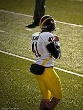 As a senior, Meskó once punted a ball 70 yards in the air.[23] As a senior punter and placekicker Meskó was a part of the focus of opposition game plans.[24] He averaged 44 yards per punt as a senior and dropped 16 inside the 10-yard line according to The Plain Dealer and 15 inside the 15-yard line according to the Ann Arbor News.[12][25] He was selected to play in the 15 January 2005 U.S. Army All-American Bowl as a punter.[26] During the game he drew a roughing the kicker penalty and posted seven punts including kicks of 56, 48 and 47 yards and a pooch punt that he placed inside the 15-yard line.[27] He was named an Associated Press Division II All-Ohio first-team punter.[28] He was also selected to numerous local area All-star teams as both a punter and a placekicker. He served as both punter and kicker for the Ohio team during the 2005 Big 33 Football Classic in which he was 4 for 5 on PATs.[29][30] He was recognized as the 2004 Northeast Inland All-District Division II first team punter by the media.[31] He was selected as the All-Akron Beacon Journal team placekicker and the all-Summit County punter.[32][33] The Akron area coaches selected him as both the punter and kicker for the All-Western Reserve Conference, North Division first-team.[34] He was selected to the combined Summit-Medina-Portage Counties All-Area team as the first team punter by The Plain Dealer.[35] He was the first team punter for The Plain Dealer All-area team.[36] Although Meskó's high school required 40 hours of community service, he performed over 300 hours.[12]