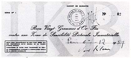 Zone de Sensibilité Picturale Immatérielle (Zone of immaterial pictorial sensibility) is an artist's book and performance by the French artist Yves Klein. The work involved the sale of documentation of ownership of empty space (the Immaterial Zone), taking the form of a cheque, in exchange for gold; if the buyer wished, the piece could then be completed in an elaborate ritual in which the buyer would burn the cheque, and Klein would throw half of the gold into the Seine.[1] The ritual would be performed in the presence of an art critic or distinguished dealer, an art museum director and at least two witnesses.[1]